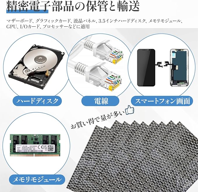 【特殊素材の特徴】導電性PETを採用し、帯電防止効果が持続し、精密電子部品の長期保管に最適な環境を提供します。