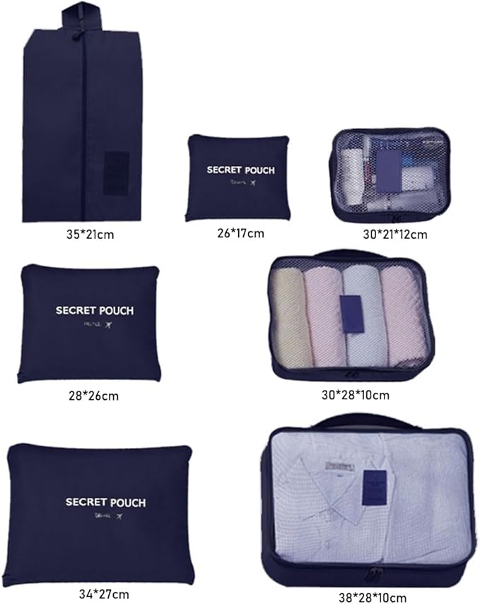 【商品仕様】衣類収納ポーチL38*28*10cm、M30*28*10cm、S30*20*10cm、シューズケース35*21*9cm、巾着袋25*15cm、小物入れポーチ26*21cm、洗面用具ポーチ34*24cmです。