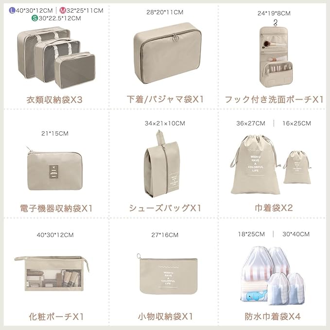 【15点科学トラベルポーチ セット】セット内容:15種類の異なるサイズのトラベルポーチ。衣類収納袋:L(40*30*12cm)、M(32*25*11cm)、S(30*22.5*12cm)、下着・パジャマ用袋:28*20*11cm、 洗面用具袋:24*19*8cm、電子機器用袋:21*15cm、靴袋:34*2110cm、巾着袋2:36*27cm / 16*25cm、防水袋*4:40*30cm、小物収納袋:27*16cm、洗面用品袋:26*15*8cm。衣類、靴・帽子、洗面用品、デジタル機器を簡単に分類し、スーツケースのパッキング効率を向上。このトラベルポーチ セットは出張、アウトドア、日常収納に最適なパッキングキューブです。