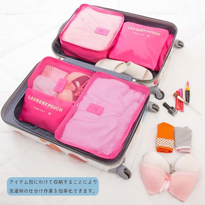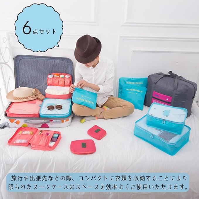トラベルポーチの6点セット。スーツケースの衣類スペースを整理してスッキリ。限られたスーツケース内のスペースの節約ができます。