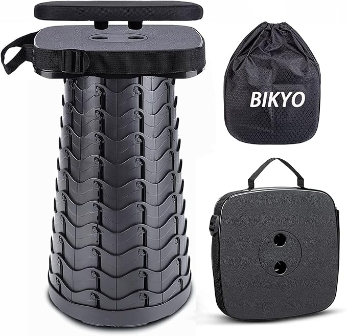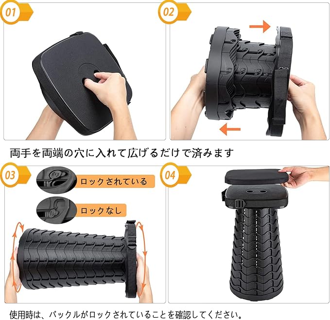 【使い方簡単、持ち運び便利】使い方簡単:少しひねりを入れながら両端を引くだけでスツールが完成。収納は逆方向に少しひねりを入れながら両端を押すだけで収納可能。また、ストラップ付きで、手に持ってでも、肩に掛けても、便利です。
