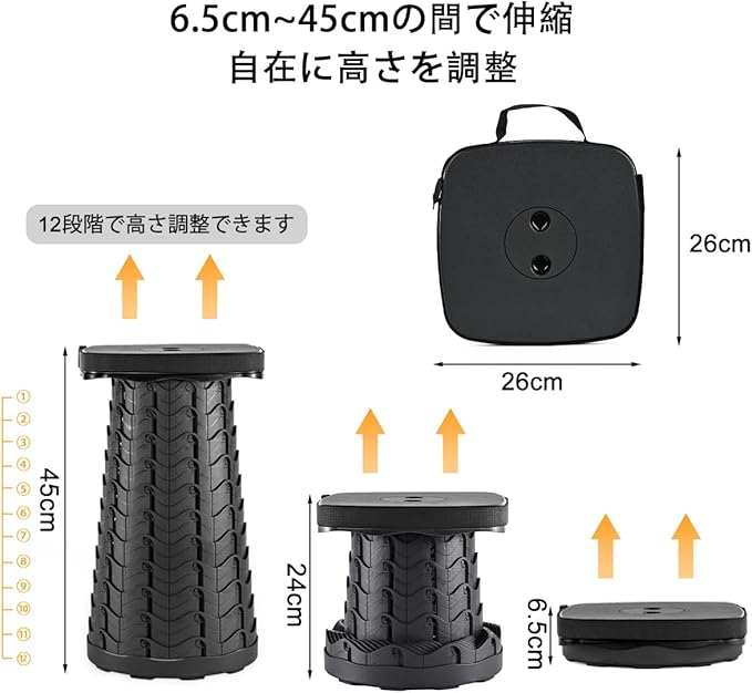 【利便性】 折りたたみチェア正規品、たった1秒で開閉可能です。6.5cmから45cmまで、12段階で高さ調整できます。設置する場 所を問わず、最適な高さで使えます。たたむと高さ6.5cm、直径26cmの角型状になるので、収納も楽々!