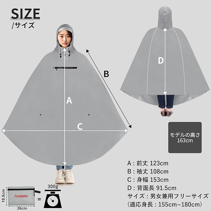 【収納一体型の便利デザイン】展開時は胸元の大型ポケットでスマホや鍵を収納可能。使用後は専用収納袋にコンパクト折りたたみ(約300g)、バッグや自転車カゴにスッキリ収納。急な雨にもすぐ対応できる携帯性です