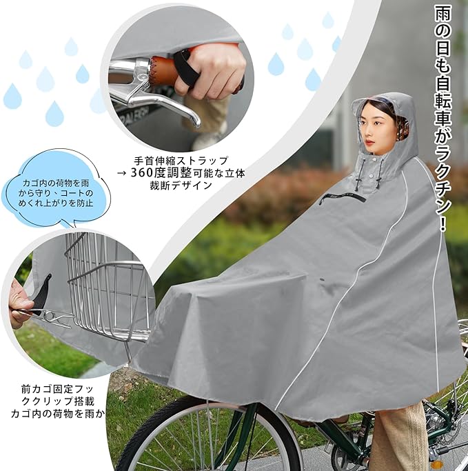 【自転車専用の実用設計】前長(123cm)後短(91.5cm)のカッティングで、前部は自転車カゴを完全カバー。後部短め設計でチェーン巻き込み防止。裾の反射テープが夜間走行時の視認性を向上させます。