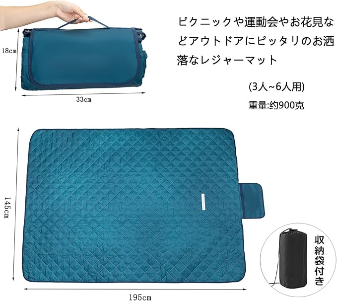 【商品詳細】展開サイズ145 195cm, 折りたたむと18 33cm,约900g。収納袋1つ付き! レジャーシート 広々サイズで大人2~5人くらいでお使いいただけます,ごろ寝してもゆったり使えます。
