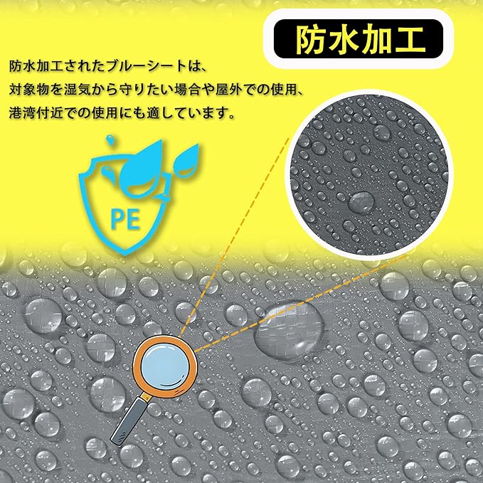 【特 徴】紫外線防止加工 UVシート、不透水性をもち 防水シート、#4000超厚手で高耐久タイプ、耐候性もあり、四隅にてゴム製の三角形スリーブはある
