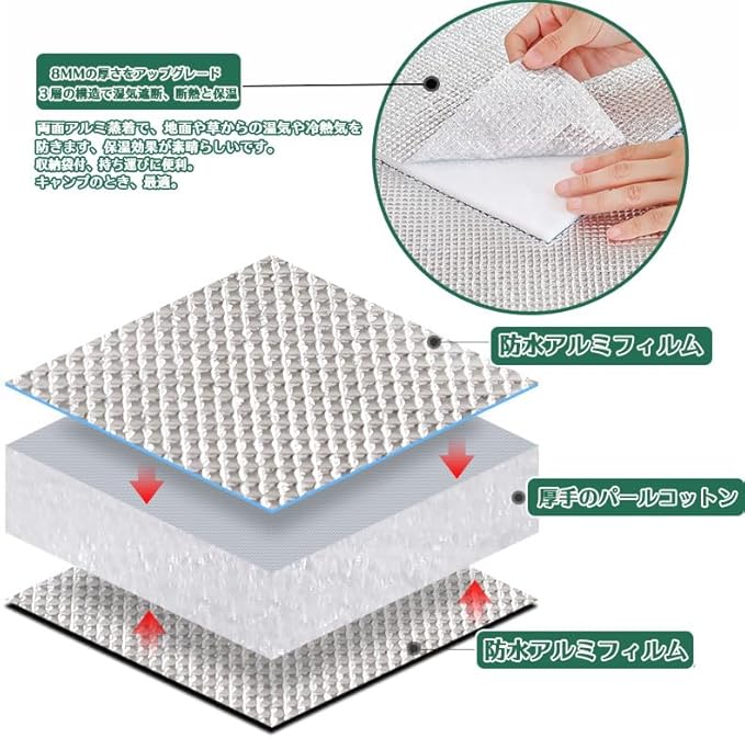 【アップグレード版素材】厚さ約8mm双面アルミニウム膜防潮マットは、両面アルミ膜の中の良質なパールコットンを採用しています。高品質のアルミホイルですので、防水防湿で、優れた断熱性と摩擦耐えの性能があり、引っ張っても割れない。
