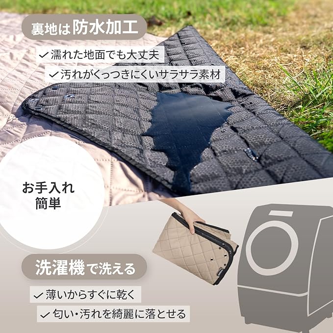 【水洗いできる】汚れや匂いが気になったら洗濯機で丸ごと洗濯できます。シートを蛇腹に畳んだ状態で洗濯ネットへ入れて別の衣類と分けてください。中性洗剤のみを使い、手洗いモードで優しく洗濯することをおすすめします。洗濯後はシワになりにくいように伸ばして干してください。(ポリエステル製のためアイロンは使えません。)