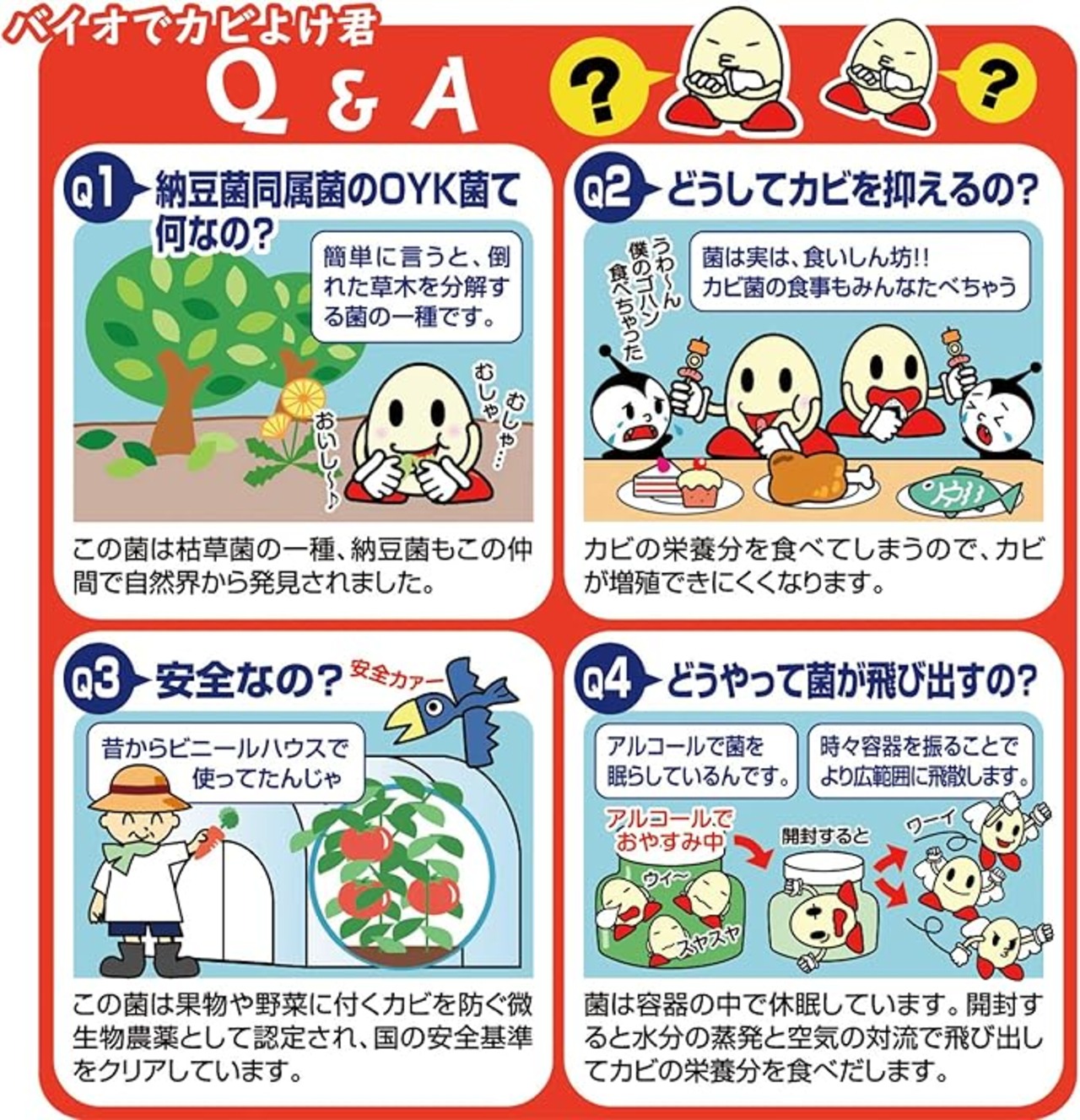 ●天然バイオがカビの発生を抑制!結露などで、カビが発生しやすい窓付近に置いてください。使い方は簡単、カビや汚れをお掃除で一旦落としていただいた後に「カビよけ君」を設置してください。有効微生物の納豆菌同属菌(OYK菌)が付近のカビ発生を抑える