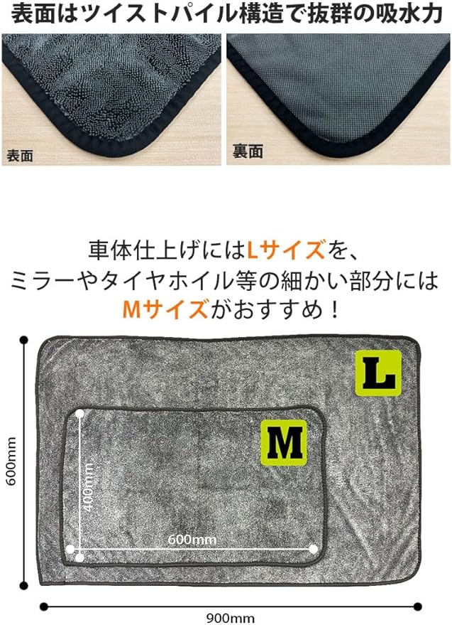 Lサイズの方は、大判サイズで素早く拭き上げができるのでSUVなどの大きなボディのドライングに最適です。拭き上げ時間短縮で作業効率もアップ。片面設計になっているので大判でも軽くてしなやかな拭き心地を体感できます。