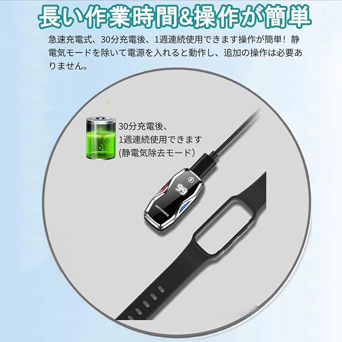 【長い作業時間&安全性と信頼性】急速充電式、30分充電後、1週連続使用できます(静電気除去モード)。時計は安全で無害、静かな蚊よけです。機械は超音波を送信し、人間の耳の聴覚の上限を超え、人に害はありません。効果は人の体格によって異なります。通常2~3週間で効果があります。そして、長く着用すればするほど、効果は高くなります。