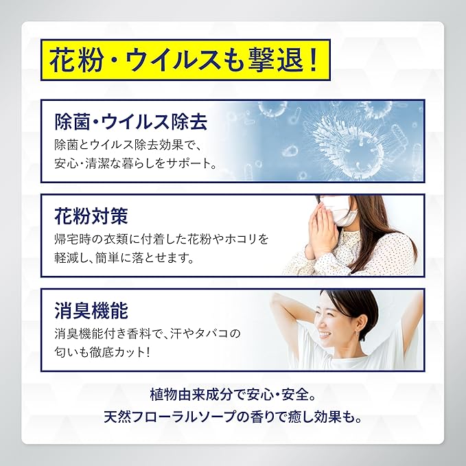✅花粉やホコリの付着も抑えるので、季節を問わず使いやすいのが特長。さらに除菌・ウイルス除去にも配慮した処方で、帰宅後の衣類についたウイルス等も素早くケアできます日々ストレスフリーに使用可能です。