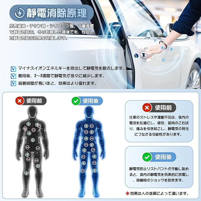 【長い作業時間&静電気除去効果up】室内でも室外でも、この静電気防止ブレスレットが静電気から効果的に保護してくれ、知らず知らずのうちに静電気の悩みを解決します。静電気除去効果は個人差があり、通常2~3週間持続します。装着時間が長いほど、効果はより優れます。このブレスレットは大量のマイナスイオンを放出し、マイナスイオンの電流平衡機能で正負の電荷を平衡させることができます。長期的に装着すると、睡眠質を向上、体のバランス改善、仕事のストレス緩和を補助することができ、実用性が満点です。