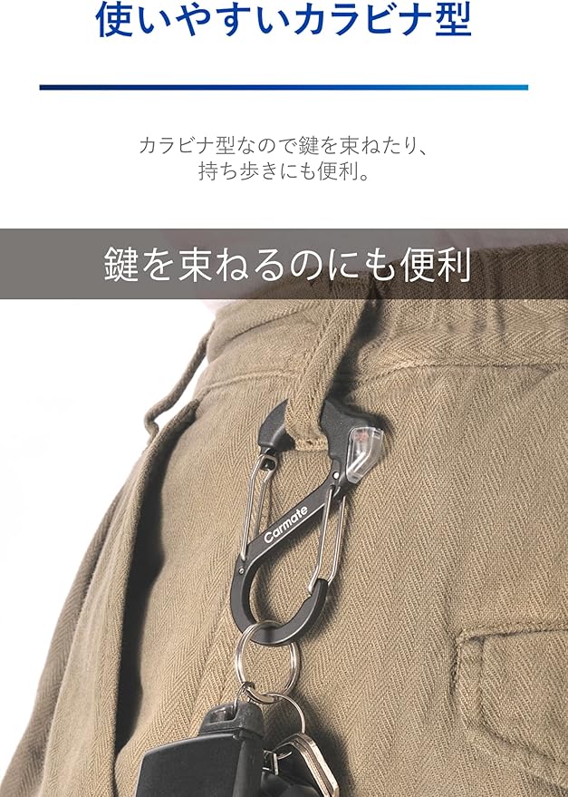●S字カラビナの形状のため、鍵を束ねたり持ち歩くのにも便利 本製品はS字カラビナの形状となっており、カラビナとしての実用性と除電機能を併せ持っているため、鍵や小物類を持ち歩くにも便利です。また、キーホルダー代わりにリュックなどに付けていても違和感がありません。