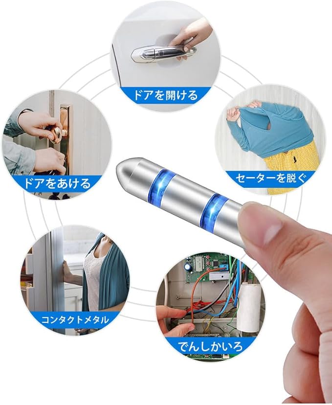 【使いやすい】:除電キーホルダーの端を握り、除電キーホルダーの頭部をドアノブに接触させるだけで除電できます。