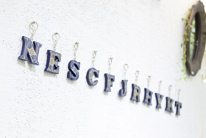 蝋けつ染めのイニシャルがモチーフのキーリング