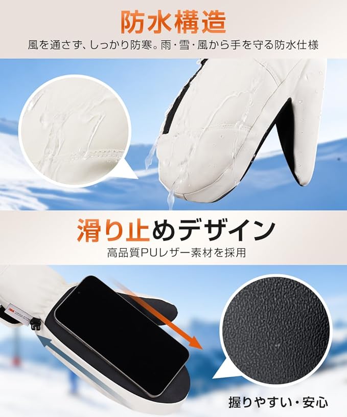 【防水 防風 滑り止め|全天候型グローブ】 スキーグローブ には表面は撥水加工済み高密度生地、内部には防水膜を内蔵し、雨・雪・冷風をしっかりブロック。掌には滑り止め加工を施し、ハンドル・スキーポールを確実にグリップ。防寒手袋 防水モデルとして、スノーボード・雪遊び・通勤バイク・アウトドア作業にも最適です。