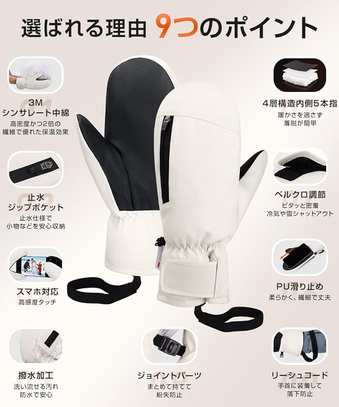 最新の防寒手袋 スキーグローブは、圧倒的な暖かさを誇る極暖4層構造 内側5本指ミトン設計を採用。外側はミトンの暖かさ、内側は5本指の細かい操作性を両立したハイブリッド構造で、指先までしっかり保温しながら快適な動きを実現します。内側には高性能断熱材3Mシンサレートを採用し、優れた保温力で真冬のスキー・スノーボードも快適。裏起毛素材が手全体を包み込むように暖め、寒冷地での屋外作業やバイク走行にも最適な防寒性を発揮します。表面は撥水加工+防水フィルムの二重構造で、雪・雨・水しぶきの侵入を防止。防風設計により冷たい外気をしっかりブロックします。さらに透湿性にも優れており、蒸れにくく長時間の着用でも快適。手のひらには滑り止め加工を施し、スキー板・スノーボード・ハンドル操作も安定。指先はタッチパネル対応で、手袋を外さずスマホ操作が可能。ポケット付きでICカード・小物の収納にも便利です。調整ベルト&紛失防止クリップ付きでフィット感が良く、持ち運びや収納時も安心。レディース・メンズ・ジュニア兼用で、スキー・スノボ・バイク・登山・釣り・キャンプ・通勤・作業用など幅広い冬のシーンで活躍します。極寒環境にも負けない暖かさと使いやすさを両立した、冬の必需品防寒手袋・スキーグローブです。