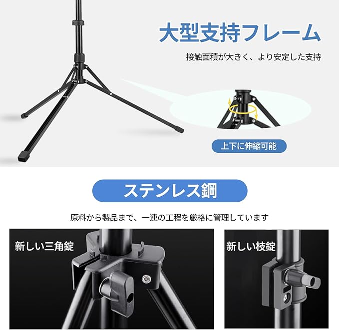 【 頑丈なステンレス製で安定感抜 群】主要なパーツに耐久性の高いステンレス材を採用。しっかりと重量を支え、タブレットや大型スマホを設置しても安定した使用感を実現します。倒れる心配が少ないです。