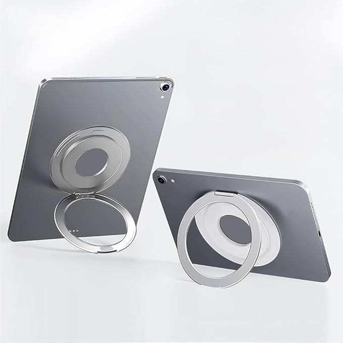タブレットホルダー タブレットスタンド iPadスタンド軽量&薄いリング型 卓上 横置き 縦置き 持ち運び便利 360度調整可能 マグネット設置可能 折りたたみ式 iPad Pro/Air/mini/Kindle 多機種対応 貼り付け パッド 落下防止 (銀)