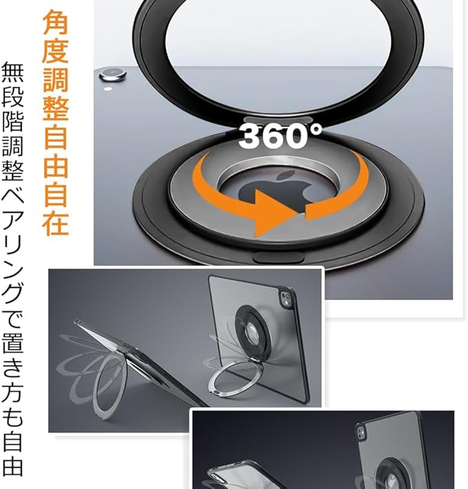 "360 iPadスタンドiPadシリーズのユーザー習慣に基づいて設計された、マグネット式スタンドユニークなデザイン★360 回転 + 180 開閉簡単★大型マグネットリング|幅広い選択肢★ステンレススチールシャフト|リバウンド式ポジショニング★隙間のないマグネットリセット★ダブルラチェットの爽快な音★アルミ合金製サポートリング[縦置き・横置き両対応]→360 回転 + 180 開閉簡単→角度無段階調整→iPadのために生まれた[角度簡単調整]→横画面/縦画面|角度無段階調整→前後2段階角度調整方法[楽な姿勢]→横画面/縦画面|角度無段階調整→ワンボタン収納[丸型で違和感なし]→精巧な職人技|独創的な研磨|丸みのある手触り"