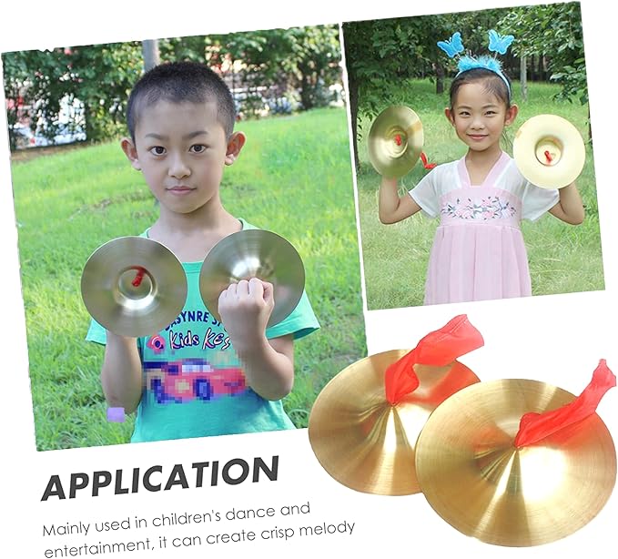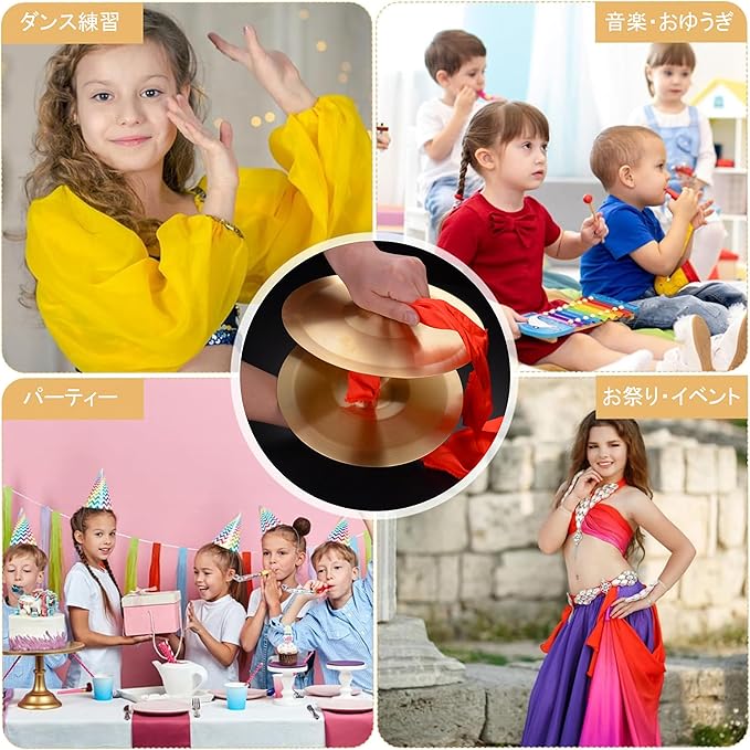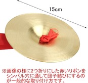 サイズ(約):約15cm 2枚1セット 材質:合金銅 重量:190g(2枚) ※赤いリボン2本が付属します。シンバルの中央の穴に通して持ち手として利用ください。