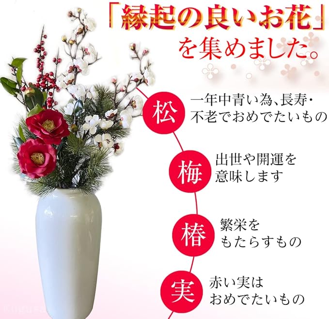 お正月の飾りにおすすめのアーティフィシャルフラワーです。簡単にお正月気分を味わえます。お部屋・玄関などの迎春のお花として。飲食店やホテル、ディスプレイなどに和風の装飾としておすすめです。