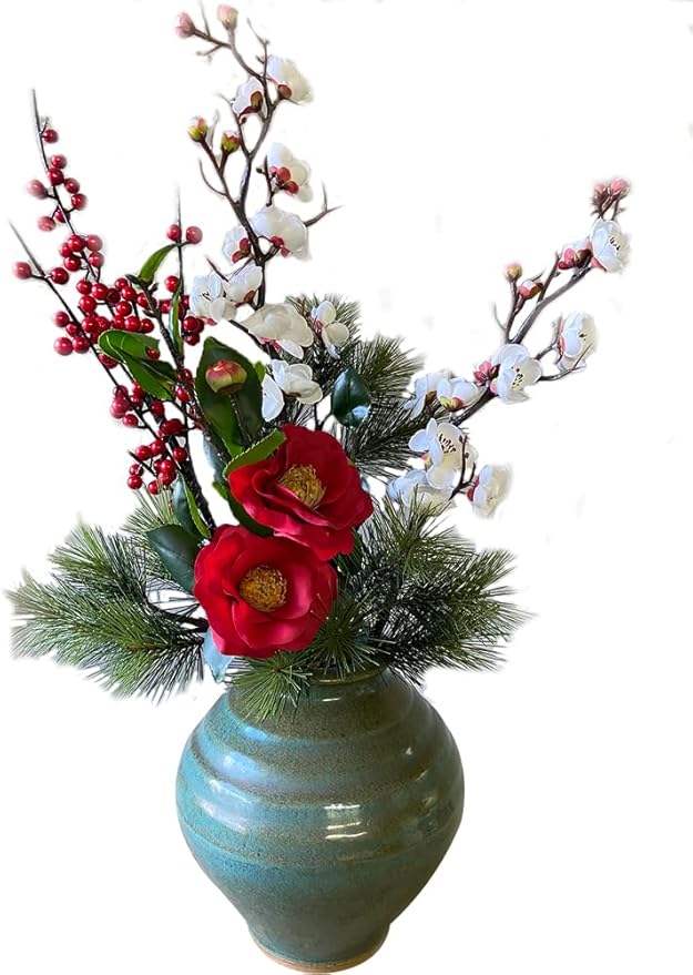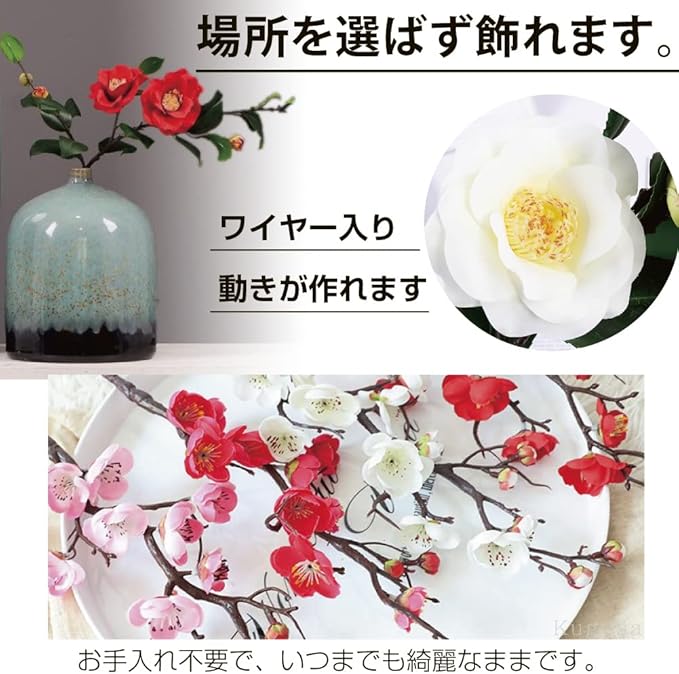 3タイプのアーティフィシャルフラワーをご用意しました。梅の各色の5本セット。椿紅白各1本。花瓶にそのまま飾っていただいて様になるお正月セット。お好みでチョイスください。