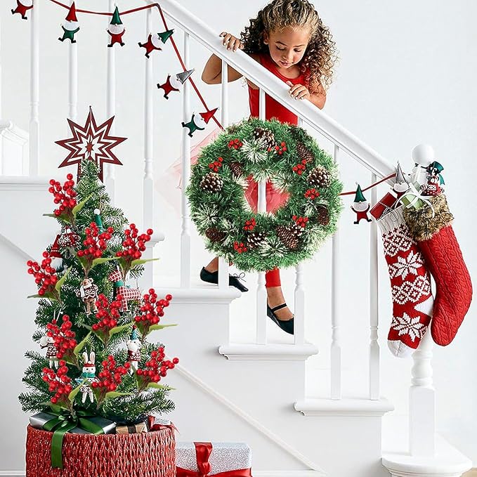 【高品質素材】: 緑の葉っぱは高品質のシルクで作られ、赤い実は発泡体で作られ、本物の果実のように色鮮やかで、表面に光泽があります。ガーランドの茎は柔軟なワイヤーで作られており、どんな装飾場所にも合うように自由に形作ることができます。