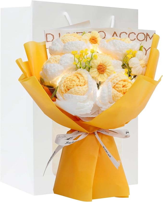 編み 造花 花束 LEDライト付き ぬいぐるみ花束 毛糸のブーケ 薔薇造花 バラ デイジー 枯れない花 卒業祝い 可愛い 感謝 お礼 女性 女友達 ギフト 誕生日プレゼント 七夕 送別会 退職祝い 卒業 結婚祝い 出産祝い 母の日 開店祝い 手提げ袋付 メッセージカード付き (イエロー)