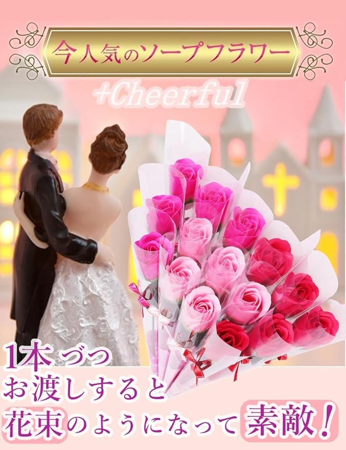 この一輪 ブーケは一本づつ包装していて リボンも付いているので ラッピングをしなくても そのままお渡しすることが出来ます。卒業式や発表会また結婚式など大勢に お配りするのにピッタリな贈り物プチギフトです。ぱっと見 生花のようでほんのり香りも付いてプリザーブドフラワーよりも お求め安く「コスパ最高!」と とても 喜ばれています。 ※香りには好みがございますので弱めに ふんわり匂うよう設定していますので どんなシーンでも幅広くお使い頂けます。