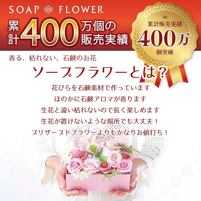 【ソープフラワーの特徴】花びら1枚12枚が石けん素材で作られた観賞用のお花です。プリザーブドフラワーと比べて花弁が大きく、値段がお手頃、石けんのいい匂いがふんわりと香るので人気があります。 生花のように水やりやお手入れの必要がなく、枯れる心配も虫や花粉の心配もありません。