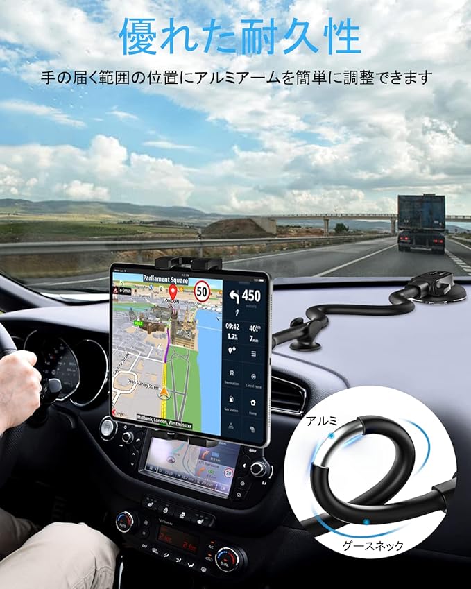 【優れた安定性】吸盤タブレットマウントはプレミアム吸盤ベースを使用しています。ダッシュボードにしっかりと固定でき、強力な吸引力を提供する粘着性のあるサクションカップベースのおかげで、デバイスを常に所定の位置に保つことができます。グースネックアームをしっかりと固定し、デバイスの振動や揺れを防ぐためのスタビライザーが付属しています。33cmの非常に長い、非常に柔軟なアームにより、手の届く範囲でデバイスを簡単に調整し、タブレット画面に簡単にアクセスできます。