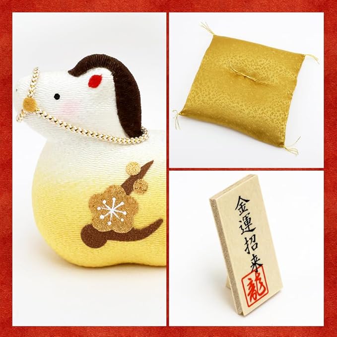 金の座布団に座ったおしとやかな午のお飾り。豊かさを象徴する金色に輝く姿は金運を運ぶともいわれています。