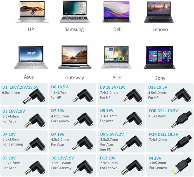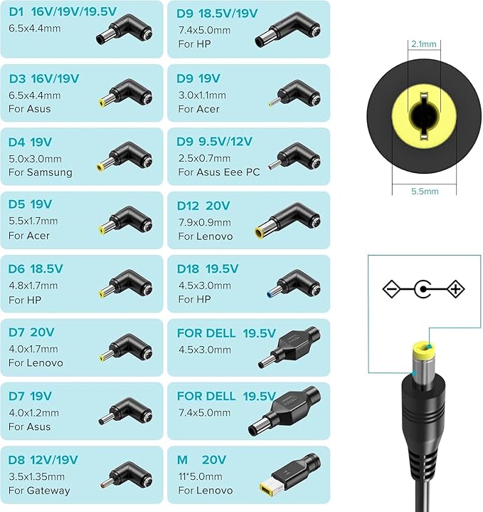 「マルチDCコネクター」6.5x4.4mm with pin-16V 19V 19.5V、5.5x2.5mm-16V 19V、5.0x3.0mm-19V、5.5x1.7mm-19V、4.8x1.7mm-18.5V、4.0x1.7mm-20V、4.0x1.2mm/4.0x1.35mm-19V、3.5x1.35mm-12V 19V、7.4x5.0mm-18.5V 19V、3.0x1.1mm-19V、2.5x0.7mm-12V 19V、7.9x5.5x0.9mm-20V、4.5x3.0mm-19.5V、FOR DELL: 4.5x3.0mm-19.5V、FOR DELL: 7.4x5.0mm-19.5V、M: Square Tip 11x5.0mm-20V