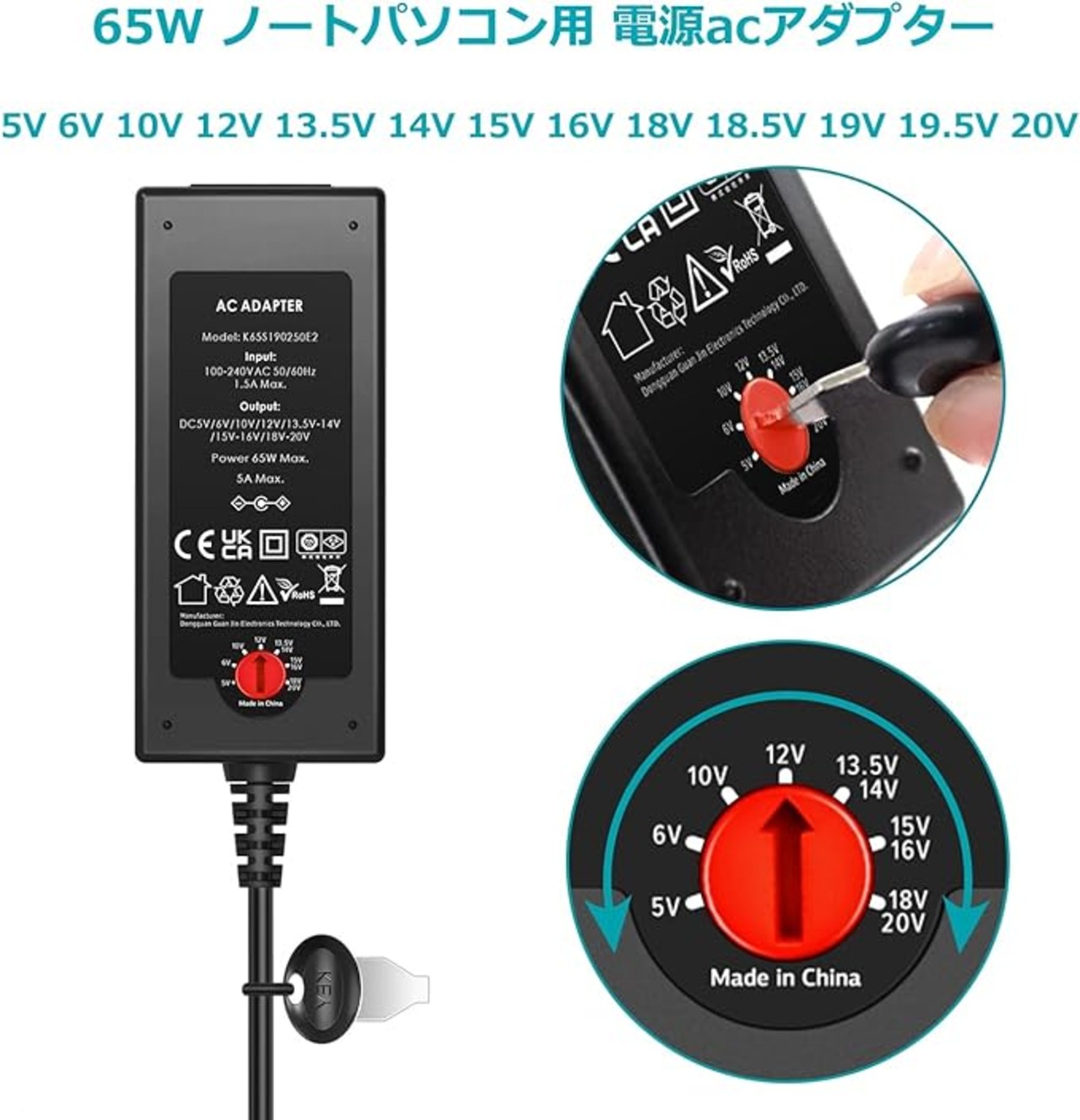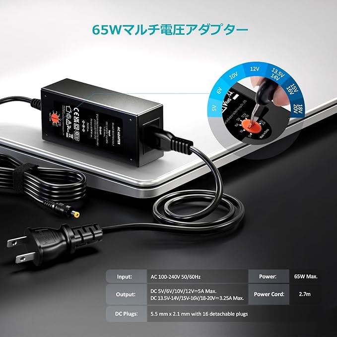 「65W ノートパソコン 電源 アダプタ」入力:100-240V 50/60Hz 出力:5V 6V 10V 12V 13.5V 14V 15V-16V 18-20V マルチ電圧アダプタで 5A MAX、16種類のDCコネクタで提供しておりますが、ご不便になった場合、ご了承ください。ACケーブル:1.5m DCケーブル:1.2m です。
