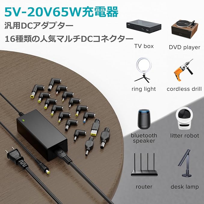 「マルチ電圧W=V*A」5V 6V 10V 12V 13.5V 14V 15V 16V 18V 18.5V 19V 19.5V 20V 、65W以上のノートPCに対応できません。詳細ページに記載されていないデバイスやモデル用にこの製品をご購入頂きたい場合、お手数ですが当店までメッセージにてご連絡下さい、また、お客様がお持ちのデバイスの限定商品、そのモデル番号または電源アダプタのモデル番号、電圧、電流、DCコネクタのサイズをお知らせください。