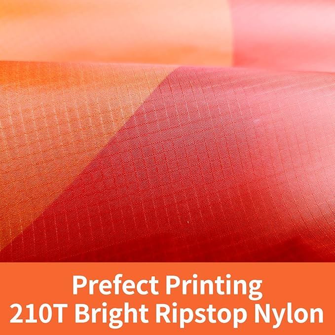 【素敵なプリント】ブラック、レッドからイエローのグラデーションの図形で、凧が注目を集めます。厚手の210Tナイロン生地に素敵に印刷されます。凧揚げの時、空に輝いています。