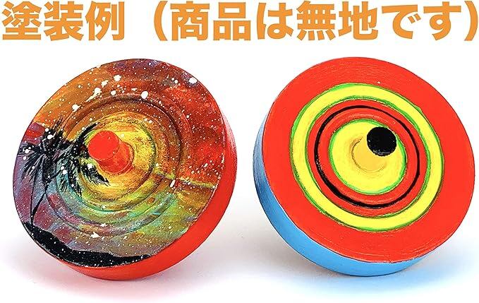 本体は無塗装ですので絵の具やサインペンで色をぬってオリジナルの独楽に仕上げるのも楽しいです。作例はアクリル絵の具で塗装しています。
