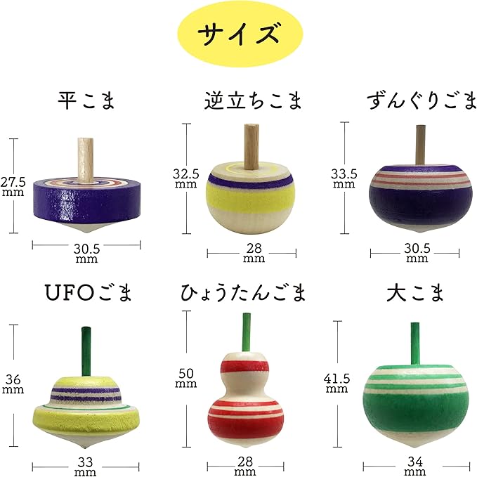 【詳細】サイズ 逆立ちこま(1個)約W28mm D28mm H32.5mm / 重さ約7g、平こま(1個)約W30.5mm D30.5mm H27.5mm / 6g、大こま(1個)約34mm D34mm H41.5mm / 重さ12g、ひょうたんごま(1個)約W28mm D28mm H50mm / 7g、UFOごま(1個)約W33mm D33mm H36mm / 7g、ずんぐりごま(1個)約W30.5mm D30.5mm H33.5m / 重さ:約7g