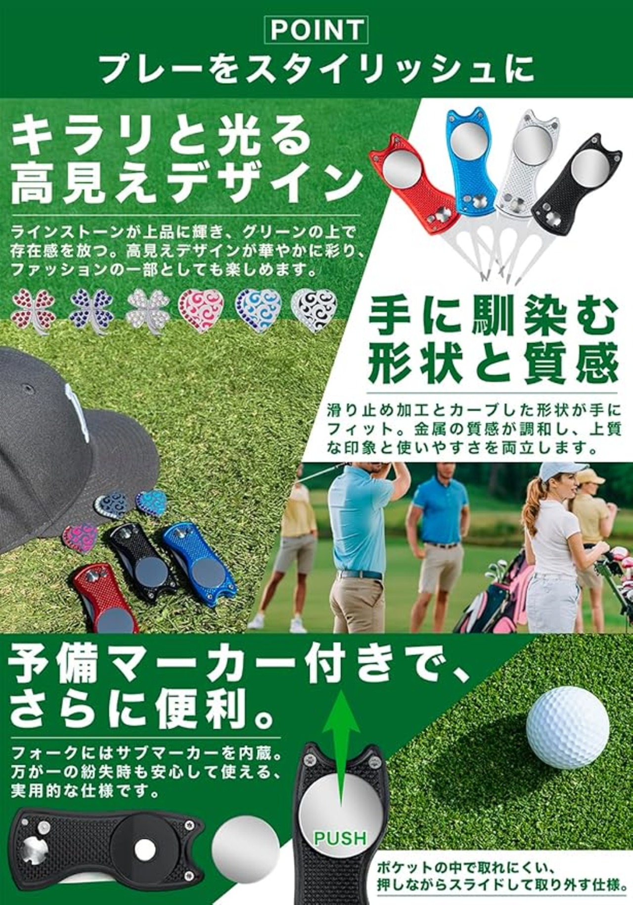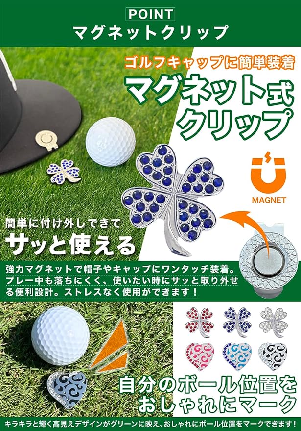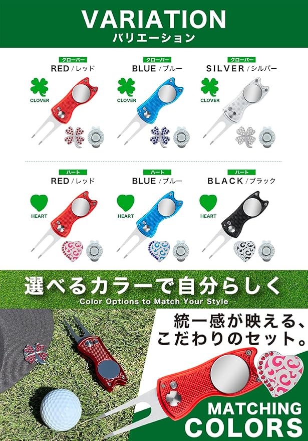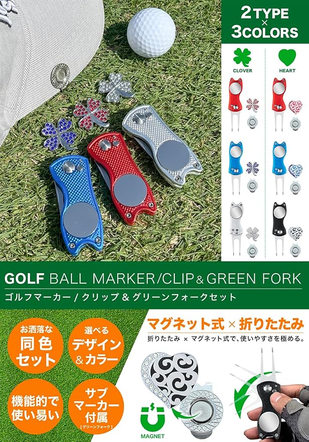 【選べるスタイリッシュカラー】四つ葉のクローバー(3色)とハート型(3色)マーカーから選べるセット。折りたたみ式グリーンフォークとハットクリップ付き、カラーもコーディネートされていてコースでの注目度アップ!