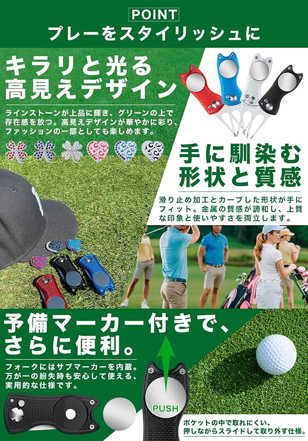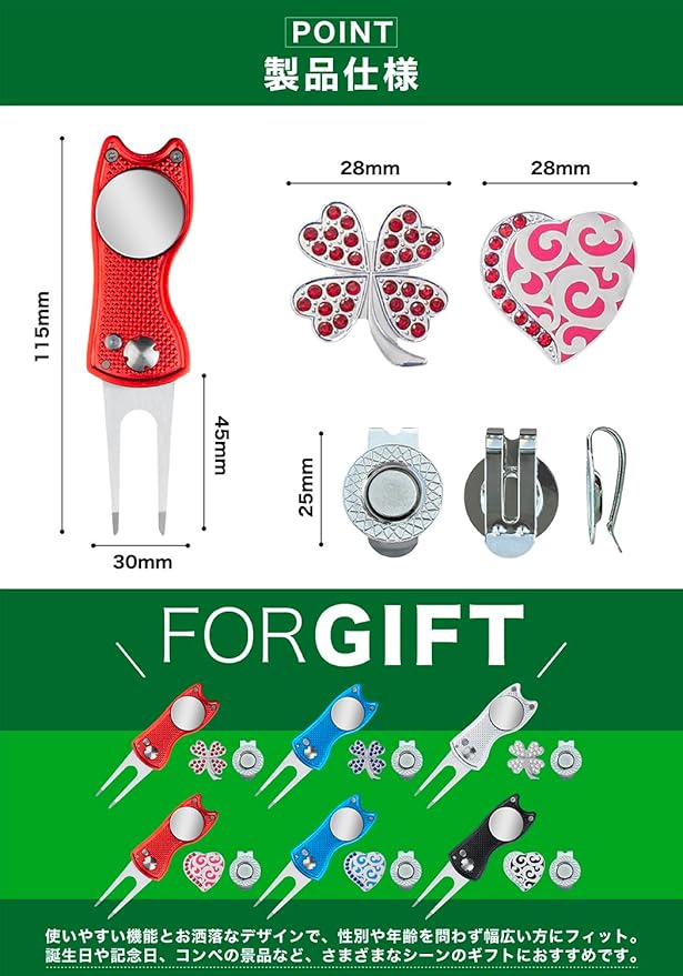 【ギフトに最適】実用的でおしゃれなグリーンフォークと色がコーディネートされた幸運マーカーのセットは、コンペの景品やゴルフ好きの方へのプレゼントにもぴったりです!