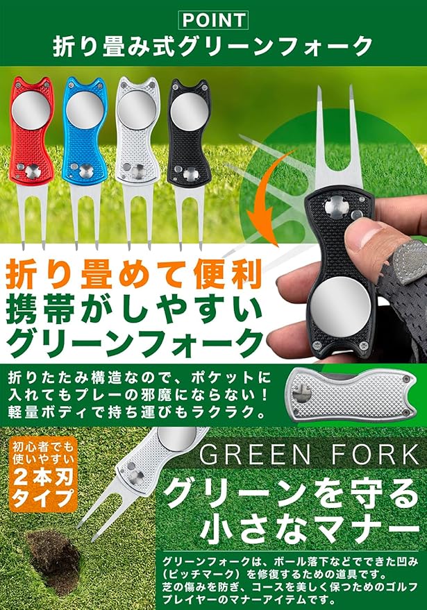 【折りたたみ式グリーンフォーク】フォーク部分が折りたためるので、ポケットやキャディバッグを傷つける心配がありません。コンパクトで持ち運びがスムーズです。