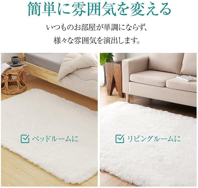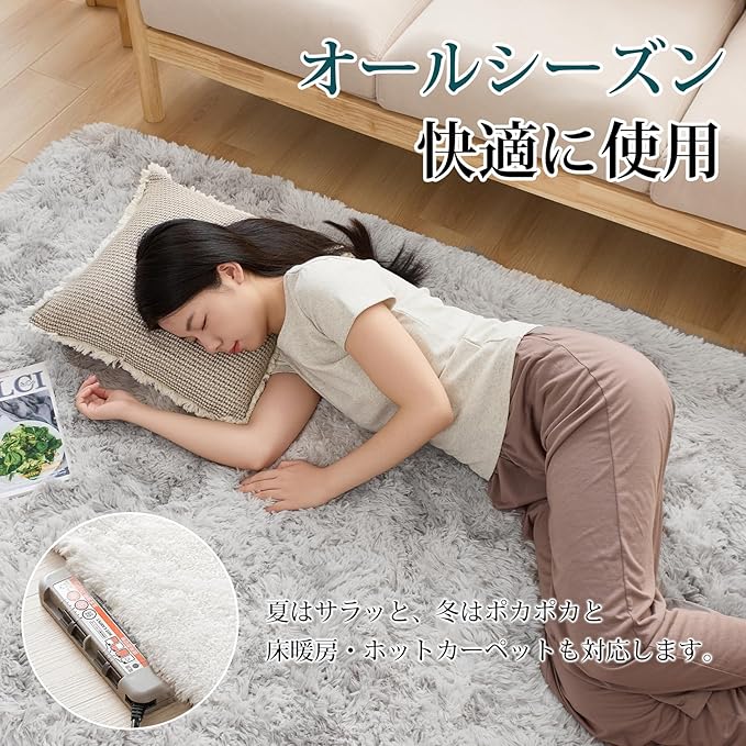 【オールシーズンカーペット】このラグの毛足は、通気性が良く、速乾性にも優れたマイクロファイバーを採用し、踏み心地は柔らかい、夏はサラッと快適に、冷房機器との併用で快適に過ごせます。耐熱加工を施しているので冬はホットカーペットや床暖房の上に敷いてもお使いでき、フワフワと暖かく、居心地がよくなります。