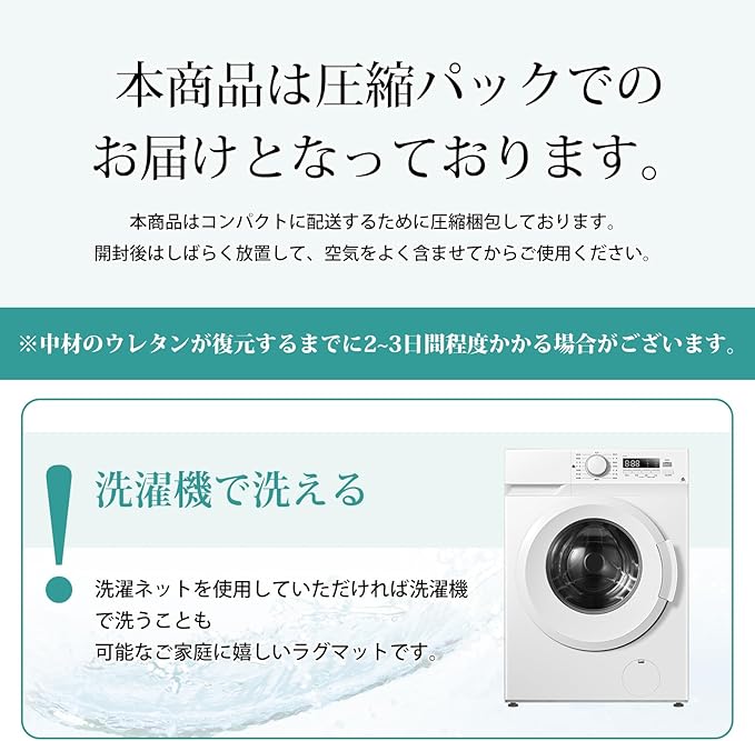 【洗えるカーペット-いつでも清潔に】ほどよいふわふわ感を持ちながら、洗濯機(洗濯ネットの使用をお勧め)で丸洗いできるので、お手入れしやすい。軽量型のラグマットなので、女性でも簡単に持ち運びでき、洗濯や取り替え、収納も気軽にできます。