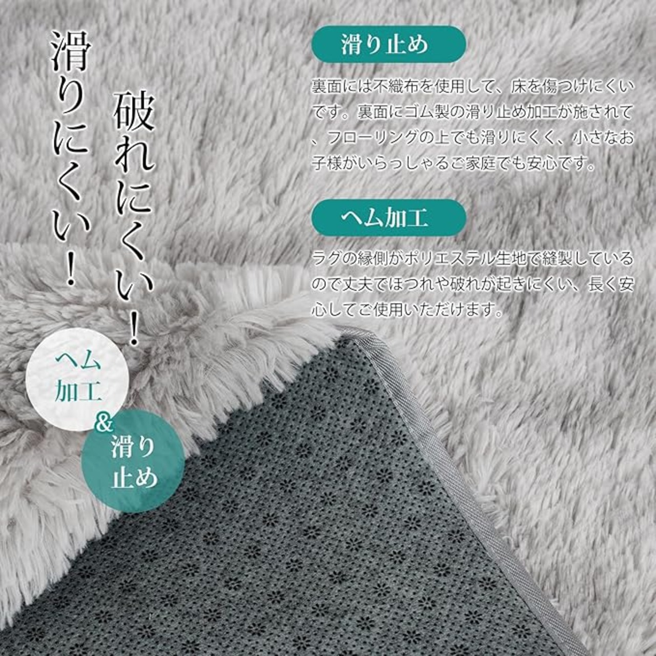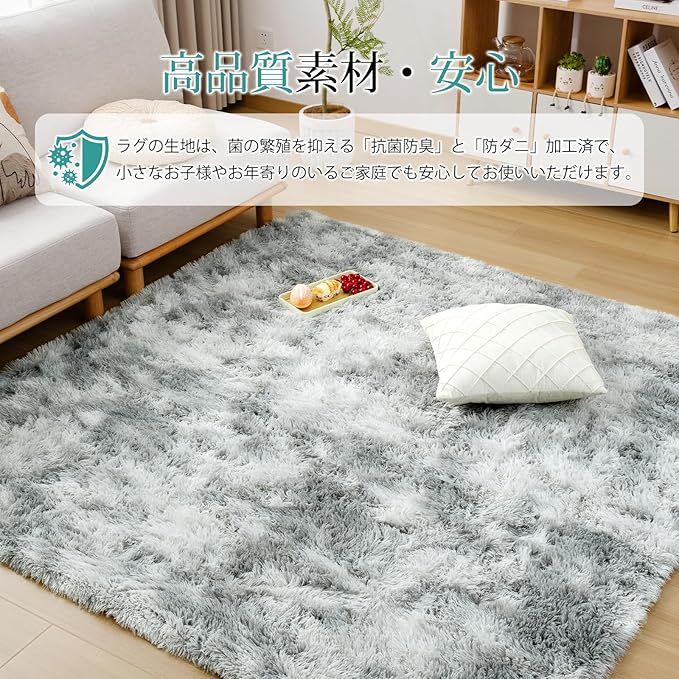 【抗菌防臭・滑り止めラグ】絨毯は抗菌防臭加工を施して、安全な品質で直接肌に触るのも大丈夫です。 ラグマットの裏面は滑り止め付き、ズレにくい、掃除機をかける時も滑らない。お年寄りやお子様のいらっしゃるご家庭でも安心してお使いいただけます。