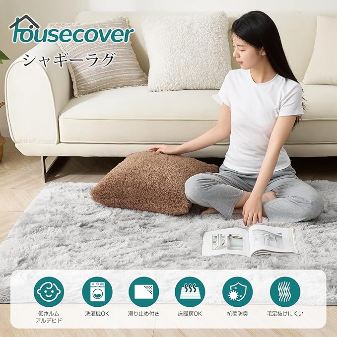 Housecover ラグ カーペット シャギーラグ ラグマット 正方形 絨毯 185x185cm 滑り止め付 洗える 防ダニ 抗菌 防臭 オールシーズン快適に使用 床暖房 ホットカーペット対応 ふわふわ肌触り ミストグレー01