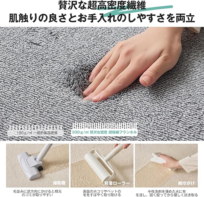 【オールシーズン】表面のフランネル素材は極細繊維のマイクロファイバーを使った、柔らかく、ふわっと滑らかな手触りを実現しています。夏はベタつかず、冬は床暖房 ホットカーペットも対応しています。ヒンヤリしないオールシーズン快適な使い心地です。