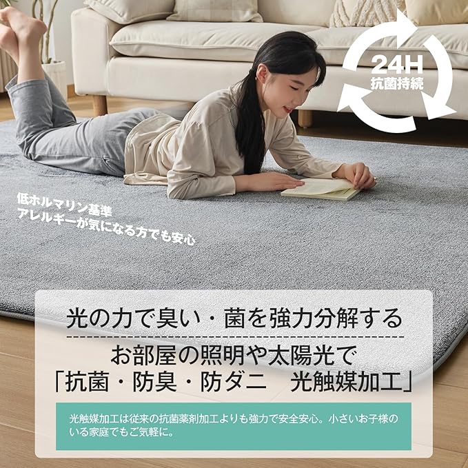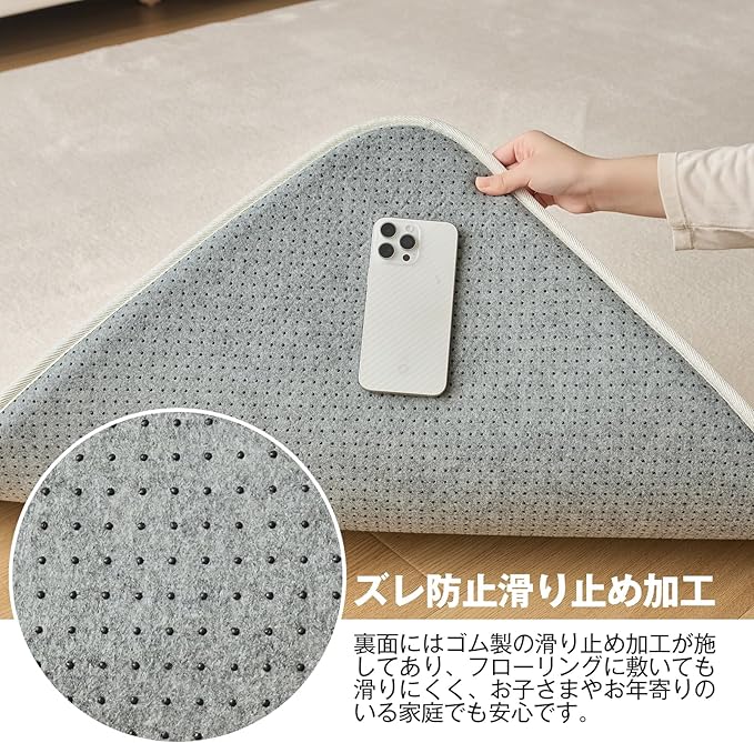 【抗菌・防臭・滑り止め加工】:ノンスリップ加工でフローリングでも安心。裏面にはゴム製の滑り止め加工が施してあり、フローリングに敷いても滑りにくいです。ワンちゃんがラグマットに飛び乗ってもずれません。