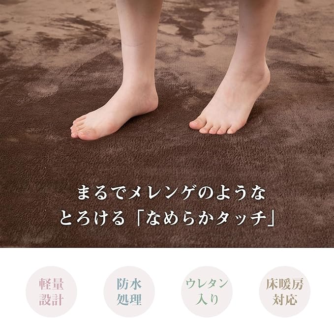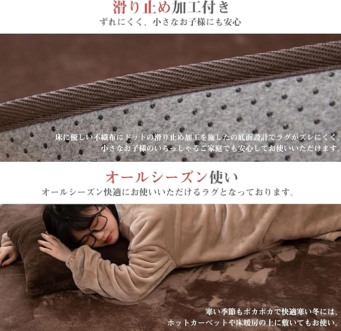 【オールシーズン快適ラグ】高品質のショートパイルフランネル素材が肌触りの良い通気性を実現。裸足でも気持ちよく、季節を問わずサラサラとした肌触りで快適にお使いいただけます。冬場の床暖房にも対応しています。